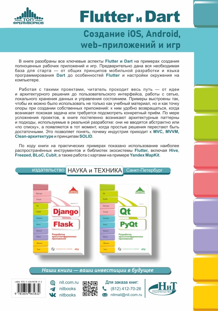 В книге разобраны все ключевые аспекты Flutter и Dart на примерах создания полноценных рабочих приложений и игр. Предварительно дана вся необходимая база для старта — от общих принципов мобильной разработки и языка программирования Dart до особенностей Flutter и настройки окружения на компьютере.