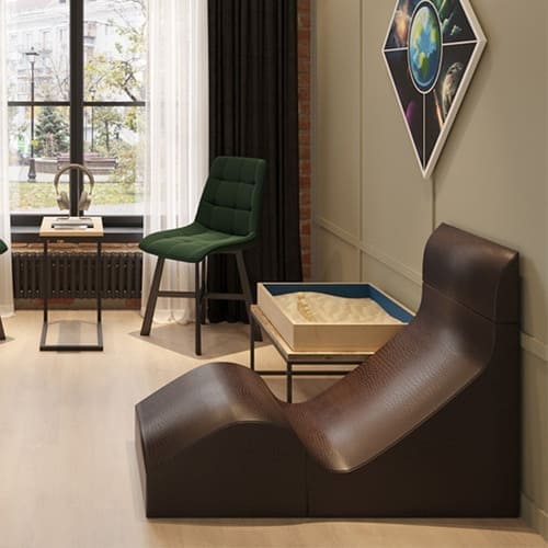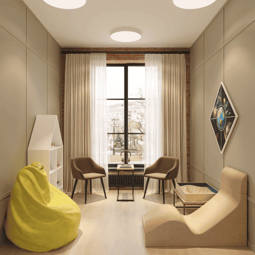 - 🪑 Кресло-кубик, кресло-мешок, стулья с подлокотниками — ни одного «для пациента». Только: «Сядь так, как можешь». Потому что слова рождаются не в правильной позе, а в возможной.