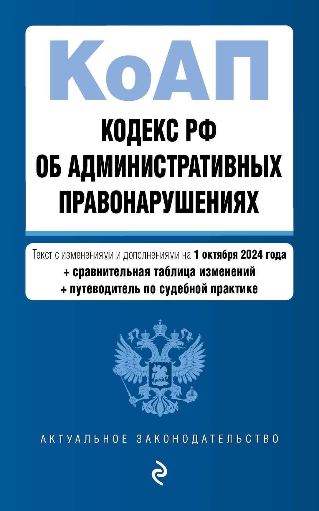 Кодекс Российской Федерации об административных правонарушениях с изменениями и дополнениями на 1 октября 2024 года с удобной навигацией по судебной практике и таблицей изменений. Если есть изменения, вступающие в силу позднее, то вместе с редакцией нормы, действующей на эту дату, приводится норма в новой редакции и указывается дата, с которой она вступает в силу.