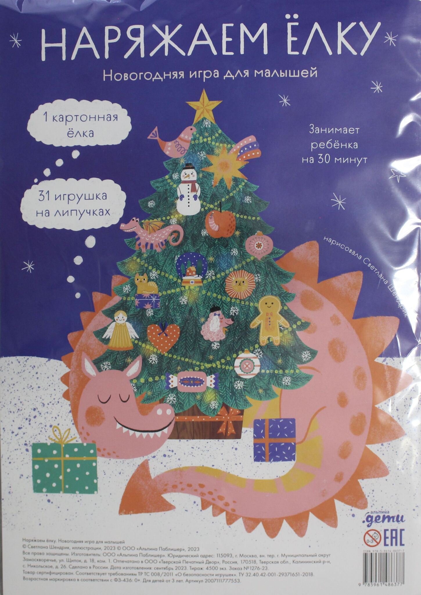 Эта новогодняя игра для ребят от 3 до 5 лет сделает досуг с ребенком необычным и увлекательным. Нарядите ёлочку вместе с добрым драконом, наполните ваш дом ощущением волшебства и праздника в преддверии Нового года. В набор входит: картонная ёлка, игрушки из картона и липучки, чтобы разместить игрушки на елке.
